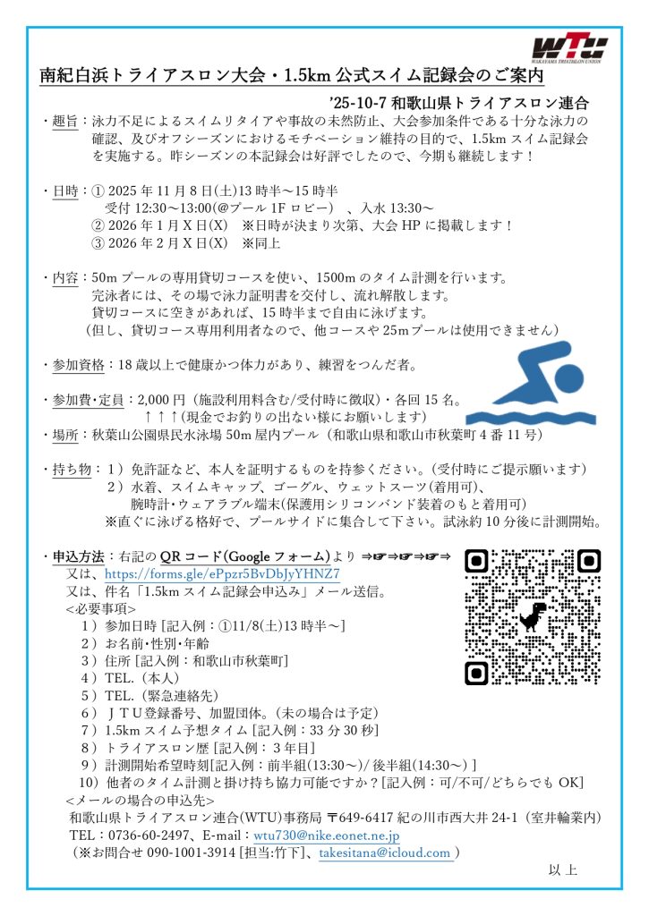・趣旨:泳力不足によるスイムリタイアや事故の未然防止、大会参加条件である十分な泳力の確認、及びオフシーズンにおけるモチベーション維持の目的で、1.5kmスイム記録会を実施する。昨シーズンの本記録会は好評でしたので、今期も継続します!